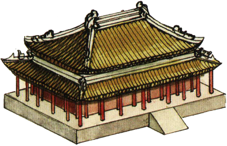 根据资料与记载,庑殿式屋顶早在殷商时代就已出现。不过,现在对唐代中期以前的庑殿式屋顶的具体结构已无从得知,晚唐以后渐有实例可查。其形象是屋面平缓,正脊较短。正脊两端为鸱尾而不是鸱首。